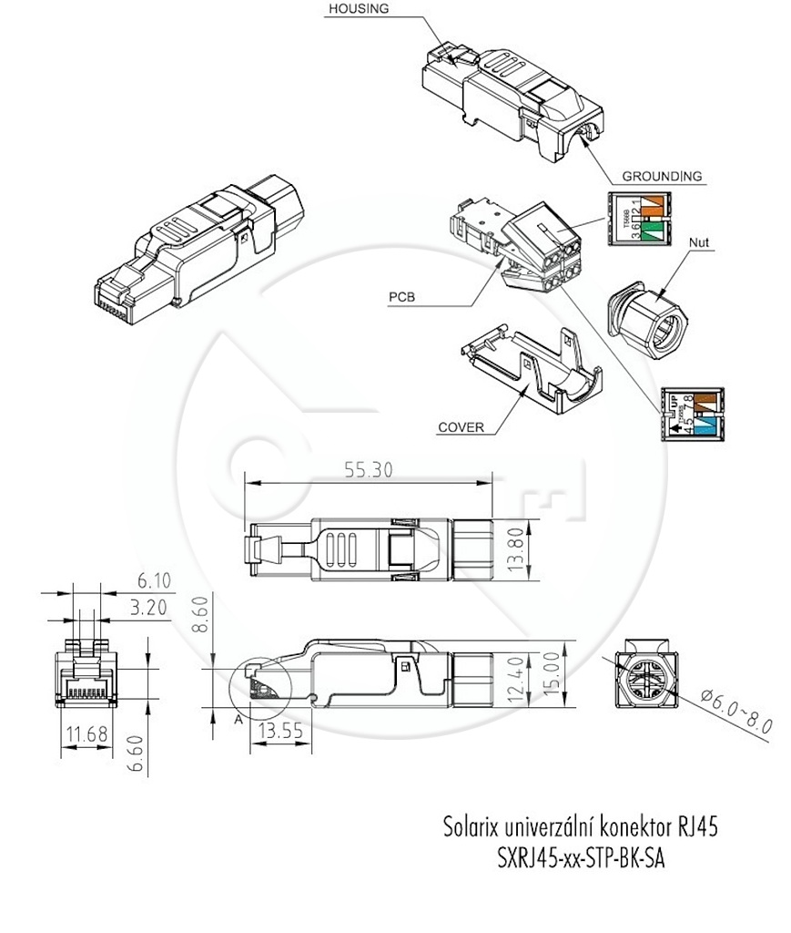 Samořezný konektor Solarix s označením SXRJ45-5E-STP-BK-SA je univerzální průmyslový konektor RJ45, který je určen pro kabely typu drát i licna a je vhodný i pro použití v MPTL (Modular Plug Terminated Link) topologii. Vyznačuje se snadnou a rychlou instalací, ke které nejsou potřeba krimpovací kleště. Vysoká spolehlivost a robustní kovové provedení tohoto konektoru umožňuje jeho použití i v náročných podmínkách. Tento konektor Solarix bez problémů splňuje všechny požadavky definované v mezinárodních standardech ANSI/TIA 568, ISO/IEC 11801 a EN 50173 pro kategorii 5E a třídu vedení Class D, včetně všech nejnovějších dodatků. Samořezný konektor Solarix kategorie 5E lze použít k zakončení kabelů s celkovým průměrem od 6,0 mm až do 8,0 mm s vodiči AWG 26-23 až do průměru 1,50 mm (včetně PE izolace).