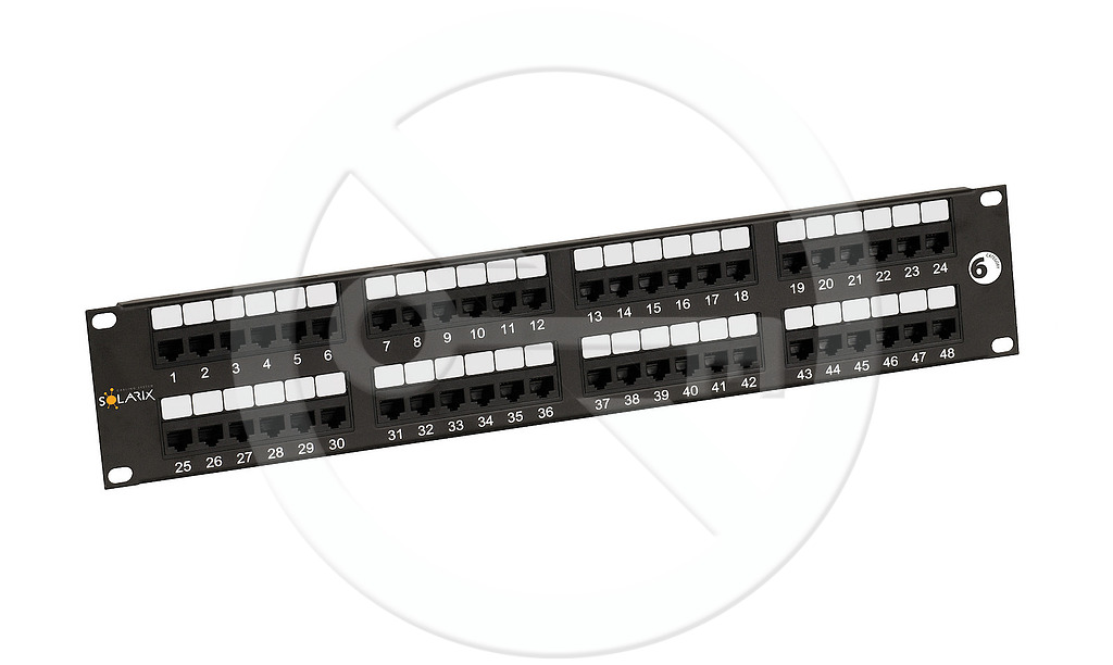 Nestíněný patch panel s označením SX48-6-UTP-BK je vysoce kvalitní panel kategorie 6, který je testován pro šířku pásma až do 350 MHz, čímž převyšuje požadavky na komponenty definované ve standardech ANSI/TIA 568, ISO/IEC 11801 a EN 50173 pro kategorii 6 a třídu vedení Class E, včetně všech nejnovějších dodatků. Panel je dodáván 48 porty RJ45 a je osazen moduly s duální IDC svorkovnicí 110/Krone. Kontakty jsou na svorkovnici z důvodu snadného zakončení datového kabelu označeny barvami podle typu zapojení, a to buď podle standardu T568A, nebo T568B. Panel SX48-6-UTP-BK patří do skupiny komponentů systému Solarix - kategorie 6 a stejně jako všechny komponenty v této produktové řadě jsou vyrobeny tak, aby poskytovaly maximální životnost, vynikající výkon, spolehlivost a především jednoduchou instalaci. Barva tohoto patch panelu Solarix kategorie 6 je černá, velikost 2U.