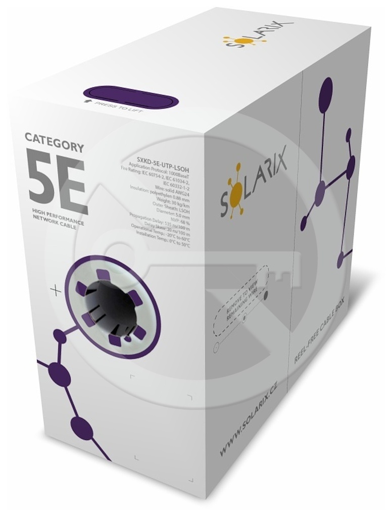 Instalační kabel Solarix s označením SXKD-5E-UTP-LSOH je spolehlivý nestíněný kabel kategorie 5E, který je testován až do šířky pásma 350 MHz, a je určený pro provoz ethernetových protokolů, včetně 2.5GBASE-T a 5GBASE-T*. Konstrukce kabelu je U/UTP, typ pláště LSOH s třídou reakce na oheň Dca-s1,d2,a1. Vodiče kabelu jsou vyrobeny z kvalitního měděného drátu s čistotou mědi 99,97%. Kabel bez problémů splňuje požadavky z mezinárodních standardů ISO/IEC 11801, EN 50173 a ANSI/TIA 568.2-D. Výkonové parametry tohoto kabelu byly otestovány nezávislou testovací zkušebnou FORCE TECHNOLOGY v rámci programu EC Verified, a to na nejvyšší úroveň tzv. Component Level. Certifikát je k dispozici zde na webu v záložce "Soubory ke stažení" nebo přímo na stránkách laboratoře FORCE. V případě CPR (nařízení EU č. 305/2011) je kabel testován v systému posuzování vlastností AVCP 3. Stejně jako ostatní kabely Solarix, je i kabel SXKD-5E-UTP-LSOH značen metráží po 1 m v rozsahu od 0 do 500 m. Kabel je dodáván ve vysoce odolném třívrstvém leštěném kartónovém boxu (vždy barevně odlišeném podle typu kabelu), na kterém jsou uvedeny všechny nezbytné produktové informace, včetně čárových kódů, výrobní šarže, popisu a nejdůležitějších technických parametrů.