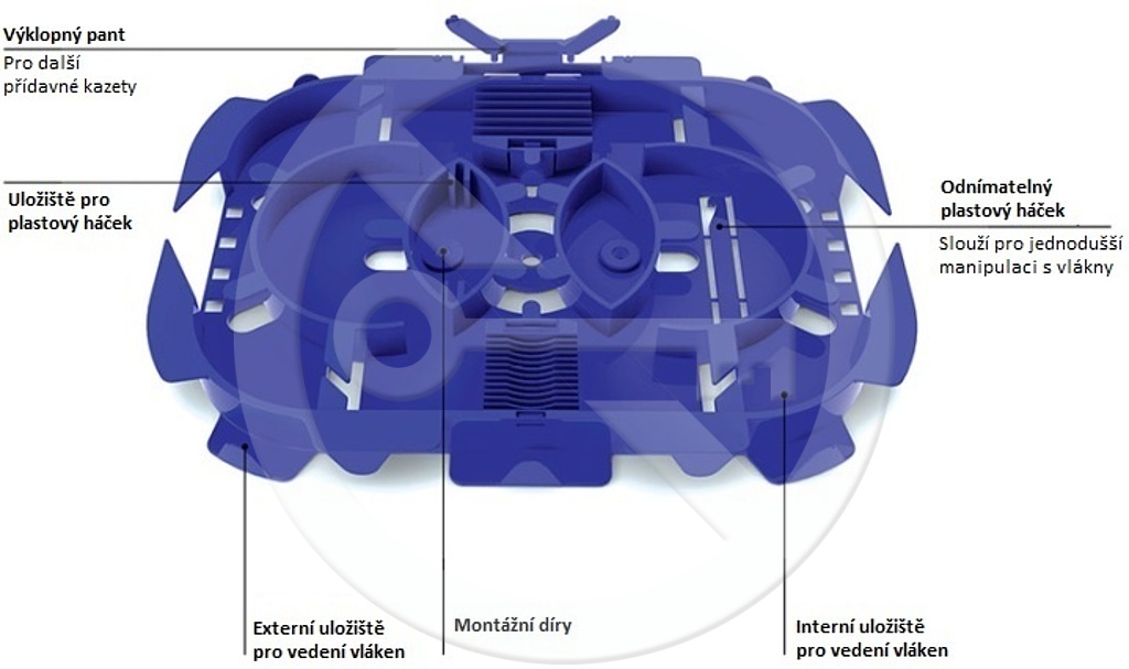 Optická kazeta disponuje unikátním systémem pro vedení vláken jak ve vnitřní části, tak i na vnější části po jejím obvodu. Součástí optické kazety jsou dva dvoupatrové hřebínky, které společně pojmou kapacitu až 24 ochran svárů. Uchycení a konstrukční řešení výklopných hřebínků umožňuje vedení vláken pod nimi samotnými. Součásti sady je průhledné plastové víko, které díky jednotlivým uchytům umožňuje pevné stohování kazet. Stohované kazety je možno vyklápět díky přídavným plastovým pantům. Vně optické kazety se nachází nástroj (plastový háček), který usnadňuje práci a manipulaci při ukládání optických vláken. Hřebínky v kazetě jsou kompatibilní pro ochrany svárů do průměru max. 2,2mm. Balení neobsahuje ochrany sváru. Kompatibilní ochrany svárů viz. sekce související produkty.