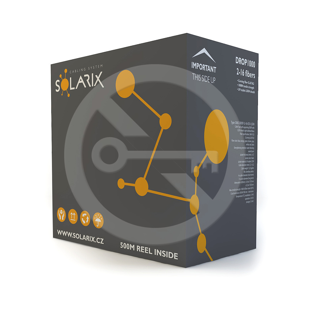 Optický kabel Solarix SXKO-DROP-8-OS-LSOH s třídou reakce na oheň Eca je vhodný pro vnitřní i venkovní instalace. Samotný vnější plášť optického kabelu je typu LSOH, je tedy v případě vznícení nízkodýmavý a bezhalogenní. Plášť navíc obsahuje speciální směs, díky které je optický kabel UV stabilní. Optický kabel disponuje velmi vysokou tahovou odolností 1000 N. Použitá vlákna G.657.A2 mají vysokou ohebnost, a tím umožňují dosáhnout vynikajících přenosových a instalačních vlastností ve stísněných prostorech a kdekoliv, kde je třeba rozvést více oddělených spojů. Kabel je možno použít jako závěsný s převěsy až 70m (dle klimatických podmínek) při použití tzv. @ mini kotev. Balení 500m.