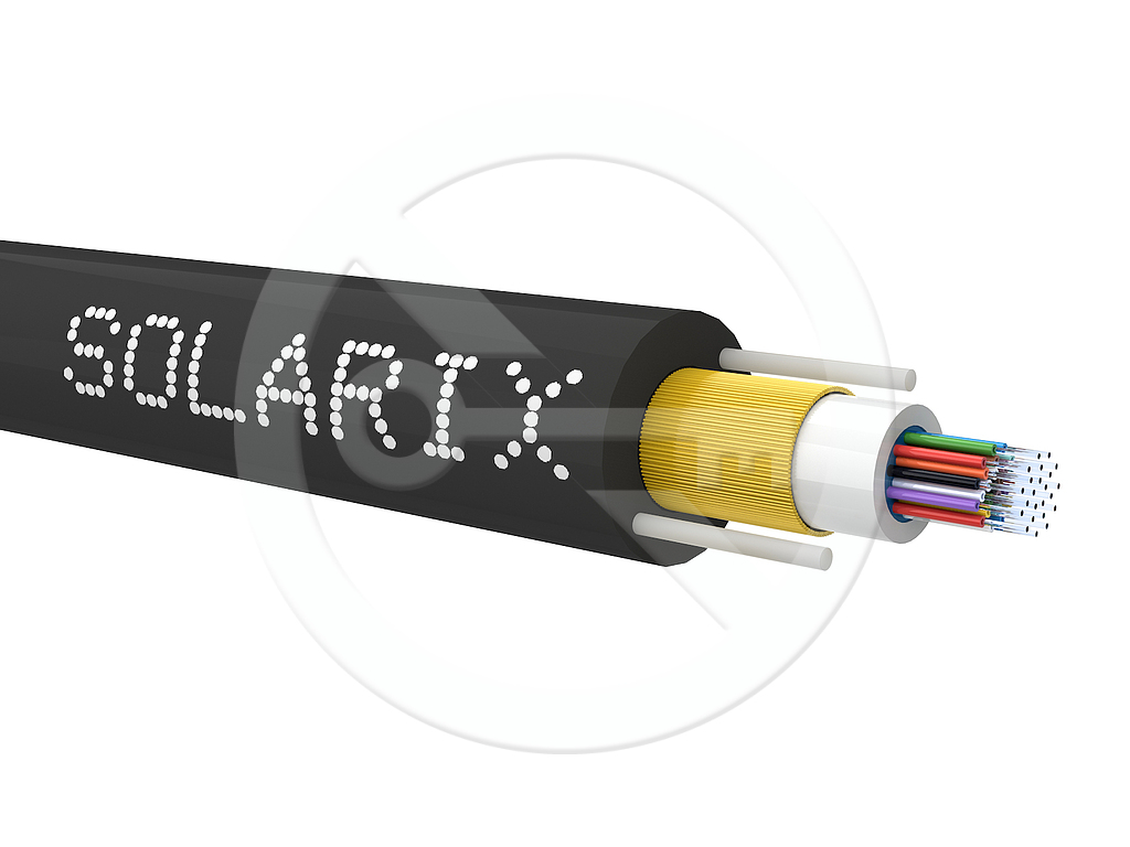 Venkovní optický DUCT kabel Solarix konstrukce CLT s aramidovou přízí, FRP tahovými členy, HDPE pláštěm a třídou reakce na oheň Fca 24 vláken SM 9/125.