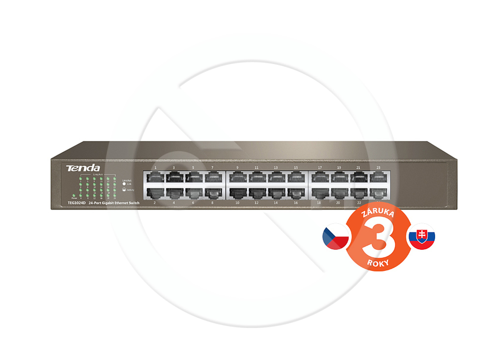 Tenda TEG1024D je 24 portový gigabitový desktop/rackmount switch. Fanless - bez ventilátorů. Auto MDI/MDIX. Ochrana proti přepětí 6000 V. Propustnost 48 Gb/s. Kovové provedení. Desktop nebo montáž do rozvaděče. Součástí balení je český, slovenský a polský manuál.