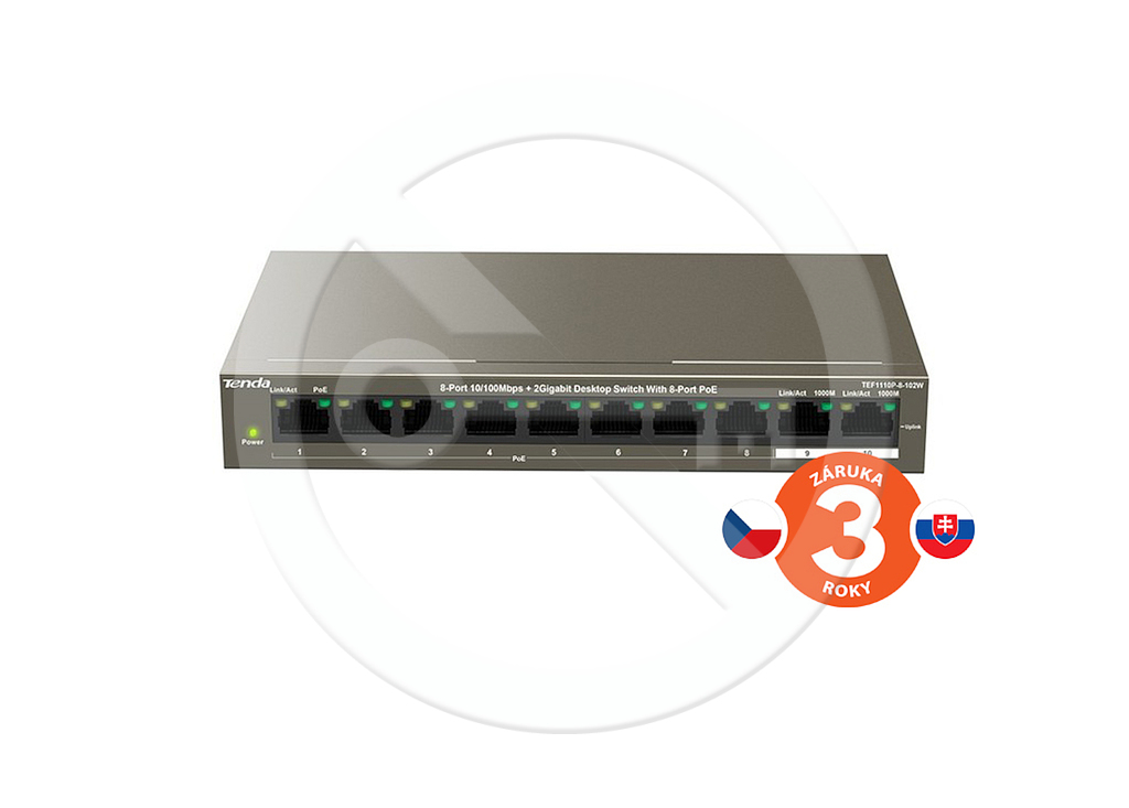 Tenda TEF1110P-8-102W přepíná data pomocí 10ti portů RJ45, 8 portů 10/100 Mb/s podporuje PoE802.3af/at + 2 porty 10/100/1000 Mb/s pro Uplink. Switch má ochranu proti přepětí 6kV. Podpora přepojování uzlů v módu Store-and-Forward. Full-duplex kontrola toku 802.3x, half-duplex kontrola toku v režimu Back-Pressure.