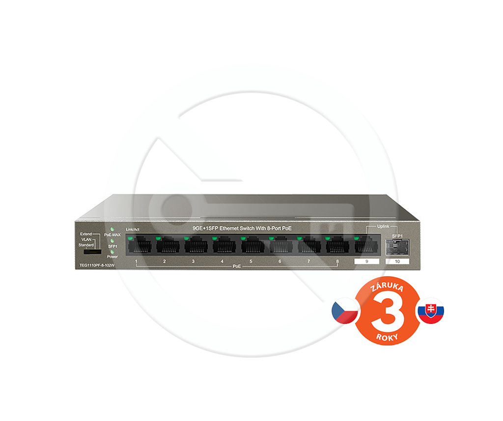 Tenda TEG1110PF-8-102W přepíná data pomocí 9 portů RJ45 a optického SFP slotu. 8 portů 10/100/1000 Mb/s podporuje napájení PoE802.3af/at, další 1 port RJ45 10/100/1000 Mb/s a SFP slot s rychlostí 100/1000 Mb/s jsou určeny pro Uplink. SFP moduly doporučujeme značky Signamax. Switch má ochranu proti přepětí 6kV. Podpora přepojování uzlů v módu Store-and-Forward. Full-duplex kontrola toku 802.3x, half-duplex kontrola toku v režimu Back-Pressure.