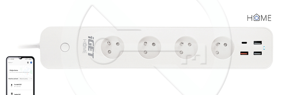 Chytrý prodlužovací přívod ovládaný přes WiFi, kompatibilní s aplikací iGET HOME, Google Assistant a Amazon Alexa, 4x USB port (2x USB, 1x USB extra charge, 1x USB-C), měření spotřeby energie, max. zatížení 3680 W, aplikace pro Android a iOS zdarma v češtině, nastavení časovačů, statistiky.