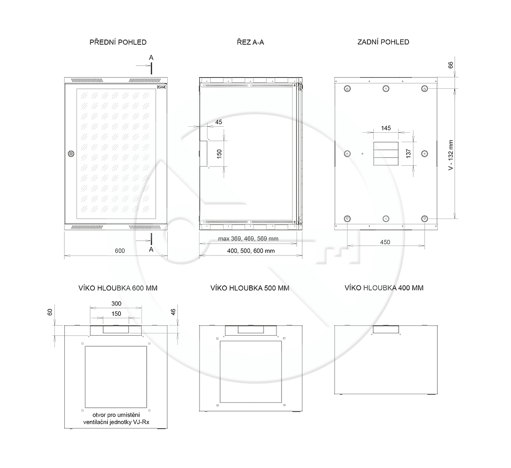 - připravené stupy pro kabeláž ve stropě, dně i na bočních stranách skříně formou vylamovacích otvorů.