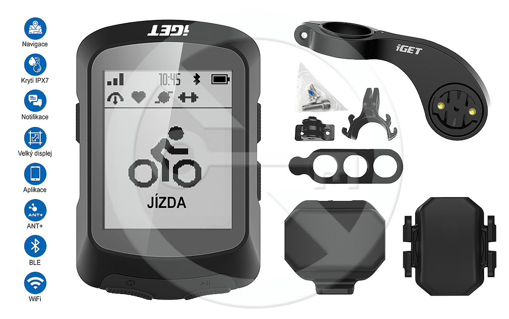 Cyclocomputer s černobílým displejem, držákem AC200, rychlostním senzorem ASPD70, kadenční senzor ACAD70 a příslušenstvím na kameru nebo světlo AC81 v balení.