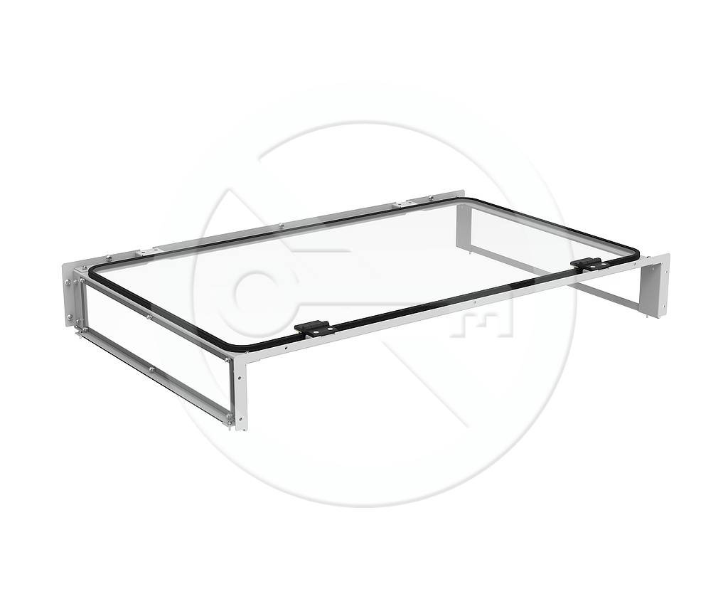 Střešní modul s vnitřní výškou 150 mm, navržený pro pro šířku studené uličky 1200mm.Horní průhledný modul je výklopný.
