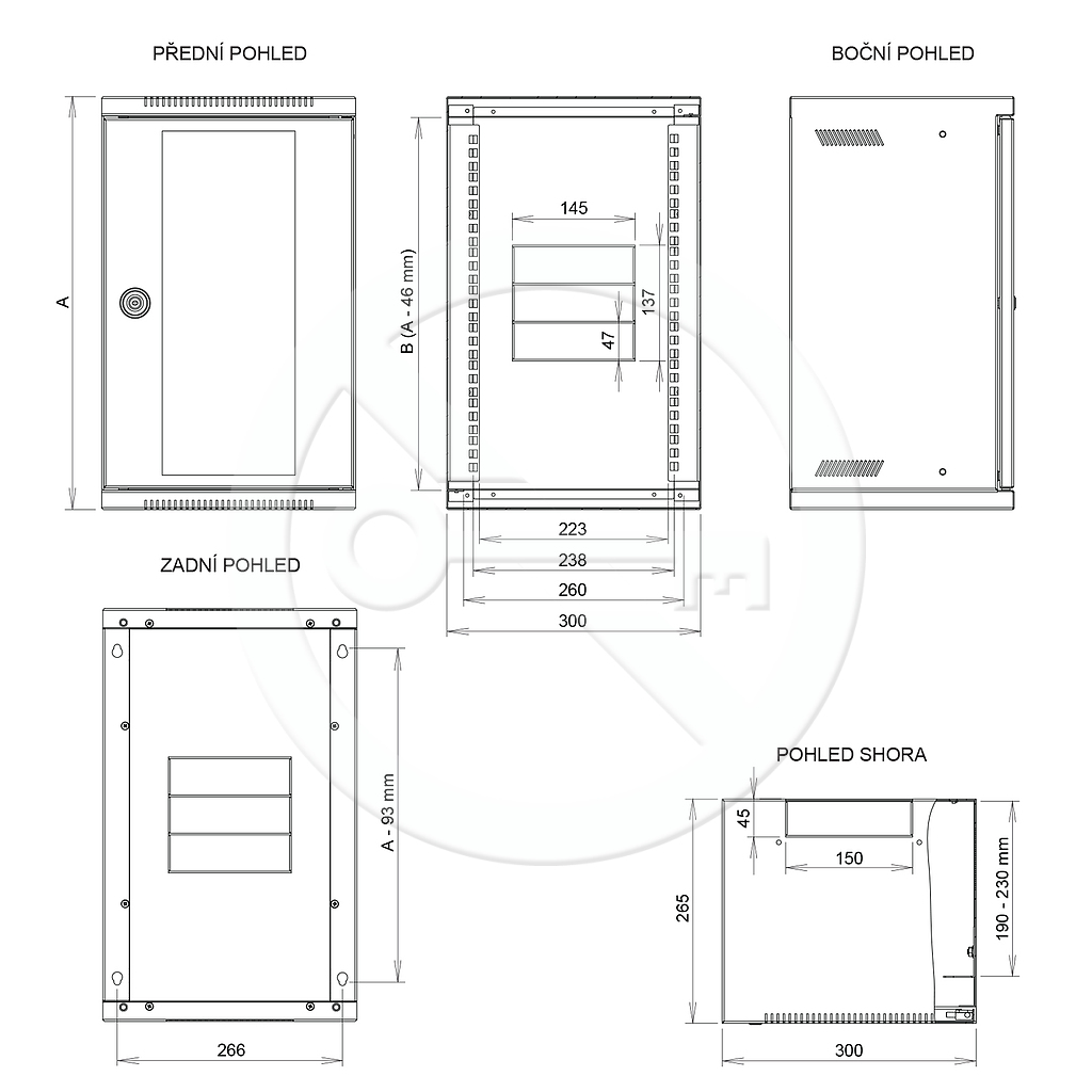 • v zadní části 4 otvory o průměru 9 mm pro uchycení na stěnu