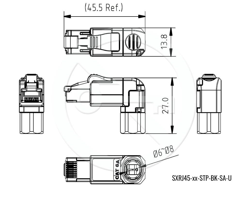 Samořezný úhlový konektor Solarix s označením SXRJ45-6A-STP-BK-SA-U je univerzální průmyslový konektor RJ45, který je určen pro kabely typu drát i licna a je vhodný i pro použití v MPTL (Modular Plug Terminated Link) topologii. Vyznačuje se snadnou a rychlou instalací, ke které nejsou potřeba krimpovací kleště. Vysoká spolehlivost a robustní kovové provedení tohoto konektoru umožňuje jeho použití i v náročných podmínkách. Tento konektor Solarix bez problémů splňuje všechny požadavky definované v mezinárodních standardech ANSI/TIA 568, ISO/IEC 11801 a EN 50173 pro kategorii 6A a třídu vedení Class Ea, včetně všech nejnovějších dodatků. Samořezný konektor Solarix kategorie 6A lze použít k zakončení kabelů s celkovým průměrem od 6,00 do 8,0 mm s vodiči AWG 26-23 až do průměru 1,50 mm (včetně PE izolace). Výhodou je možnost nasměrování zakončeného kabelu do 4 různých stran pod úhlem 90° (tj. nahoru, dolů, doleva a doprava).